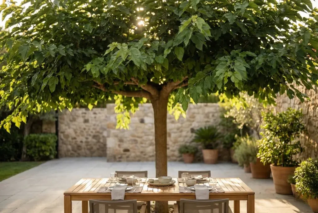 El sol de julio en Madrid hace inhabitable cualquier terraza sin sombra. La solución no es un toldo de plástico, es un techo verde. La Morera sin fruto es la «sombrilla ecológica» definitiva.