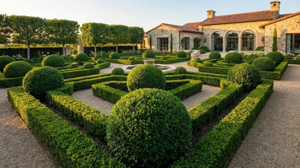 Mi consejo de diseño: Juega con la repetición. Una sola bola de boj no dice nada. Pero tres bolas de distintos tamaños agrupadas, o una fila de 5 bolas idénticas marcando un camino, crean ese ritmo visual hipnótico que ves en los hoteles de lujo.»