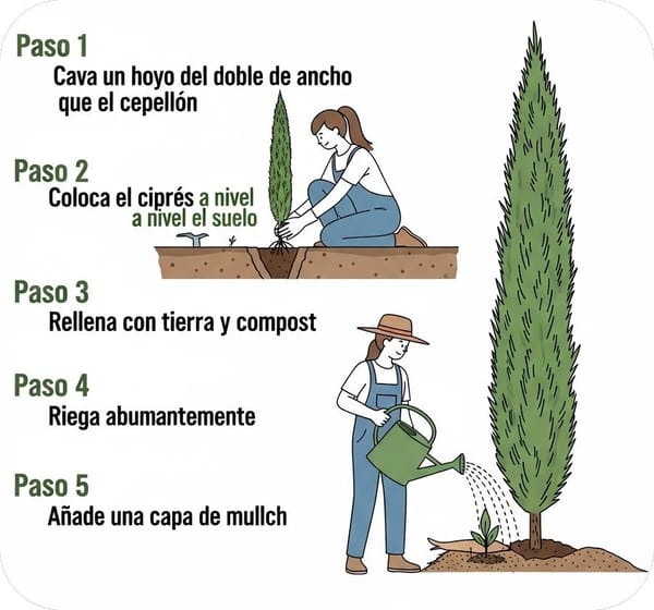 Colocar el Ciprés: Saca el ciprés de su maceta y ponlo en el centro del hoyo. Asegúrate de que la parte superior del cepellón quede al mismo nivel que el suelo. Este es el secreto para evitar problemas futuros.