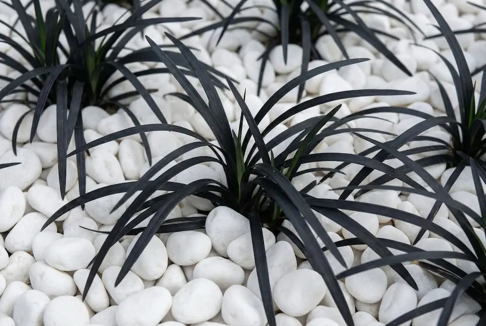 • Ophiopogon ‘Nigrescens’: La «Hierba Negra». Plantada entre grava blanca o gris, crea el contraste más sofisticado y moderno posible.