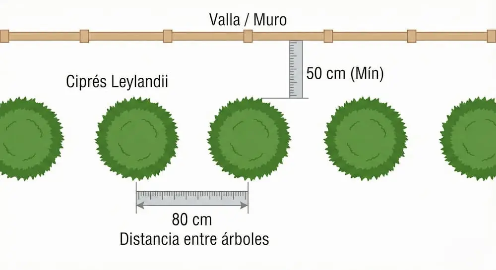 Aunque verás sitios que recomiendan 50 cm, en Leylandii.es desaconsejamos esa densidad salvo casos muy específicos. El Leylandii es un árbol vigoroso que necesita espacio.