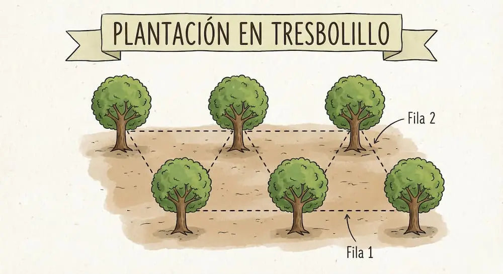 Consiste en plantar dos filas paralelas, intercalando los árboles (formando triángulos).