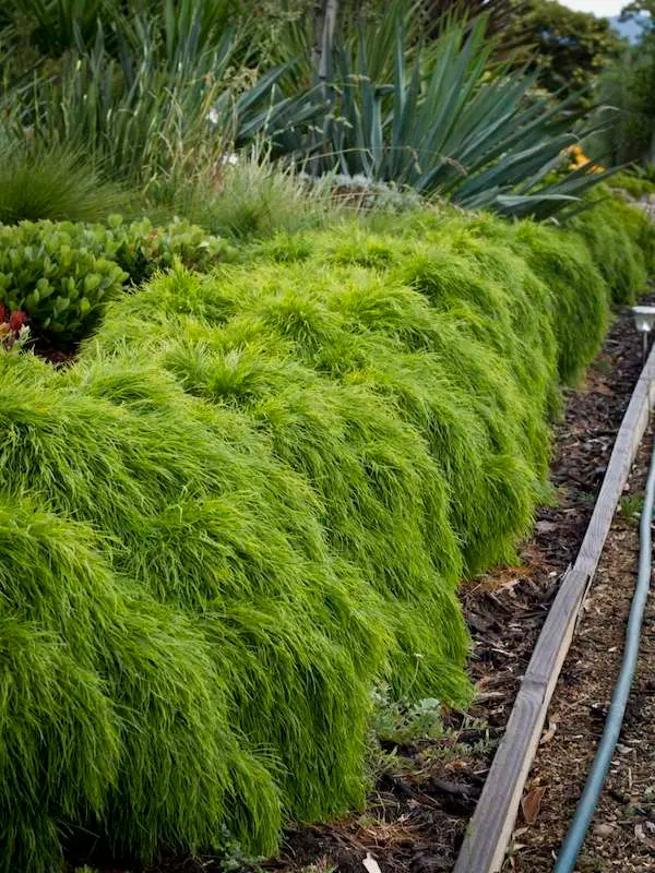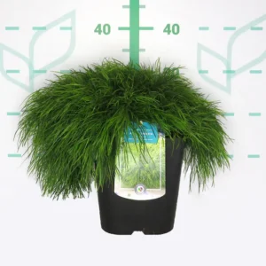 - Porte Llorón y Compacto: Crece en forma de montículo compacto y redondeado, del que caen elegantemente sus finas y alargadas hojas. Este porte, similar al de una fuente, aporta movimiento y una suavidad única.