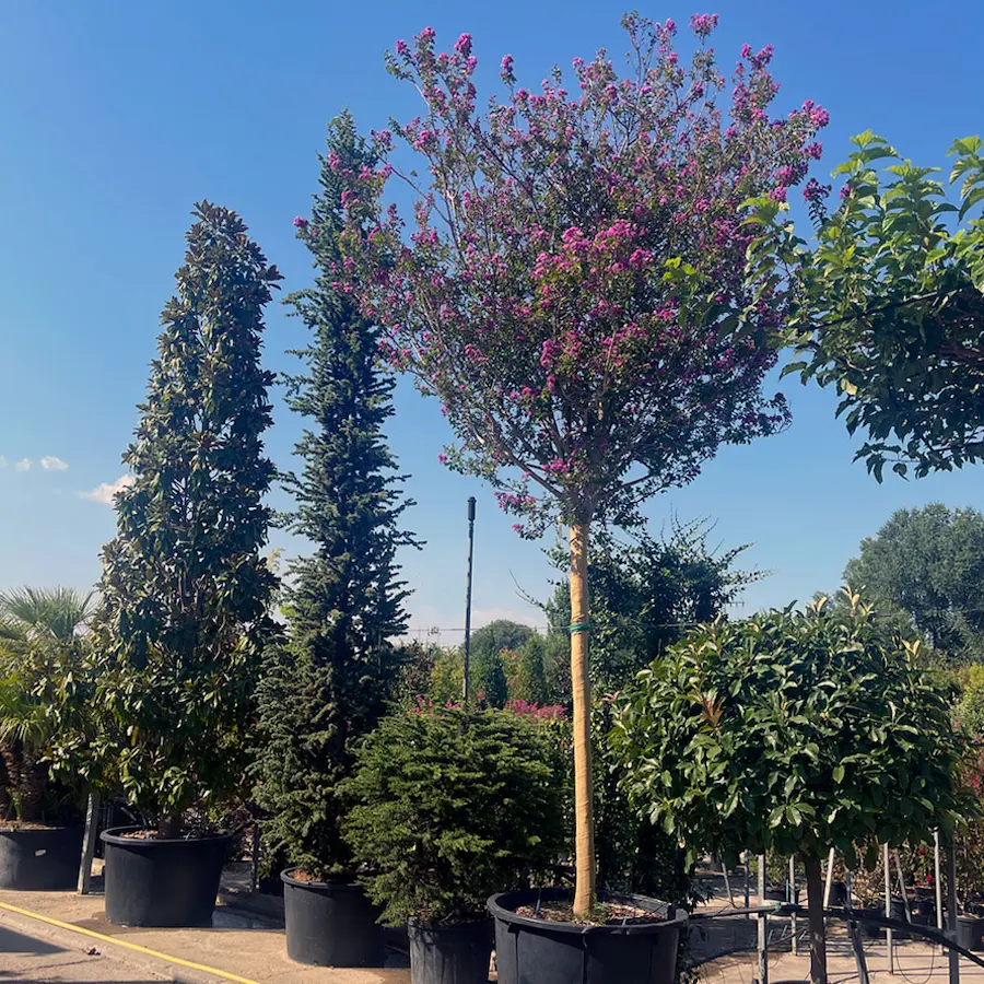 Es su mayor virtud. En un momento en que el jardín decae, la Lagerstroemia toma el relevo con una floración masiva, exuberante y de larga duración.