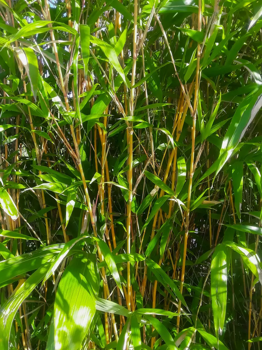 Las cañas nuevas emergen de un color verde pálido y, con la exposición al sol y la madurez, se transforman en un espectacular amarillo dorado intenso. Pero el detalle que lo eleva a otra categoría es la fina y elegante raya vertical de color verde que adorna el surco (sulcus) de cada entrenudo, creando un patrón a rayas de una belleza exquisita. Este espectáculo se complementa con un follaje denso, de un verde intenso y lustroso, que crea un contraste magnífico con el amarillo de las cañas.