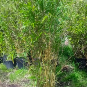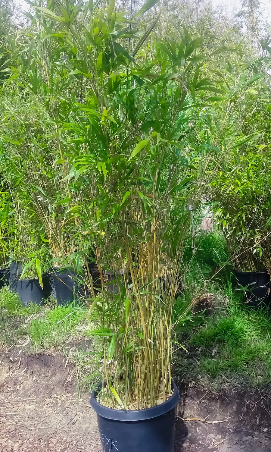El Semiarundinaria yashadake ‘Kimmei’ es una de las variedades de bambú más refinadas y visualmente impactantes. Es una elección de diseñador, una planta que aporta no solo estructura, sino también un colorido vibrante y un patrón gráfico de una elegancia sublime. Su principal atractivo son sus cañas, que crean un bosque de oro y esmeralda en el jardín.