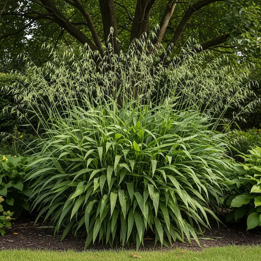 El Chasmanthium latifolium, conocido como Avena de Río o Avena Silvestre del Norte, es la solución perfecta para quienes desean la gracia y el movimiento de una gramínea ornamental en las zonas menos soleadas del jardín. Mientras la mayoría de gramíneas exigen pleno sol para prosperar, el Chasmanthium se deleita en la semisombra, aportando una textura y una elegancia incomparables bajo el dosel de los árboles o en los arriates orientados al norte.