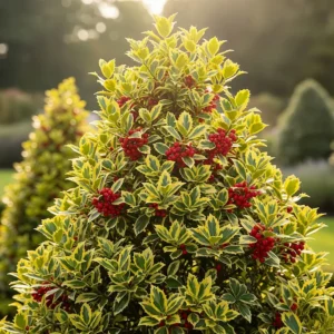 Si estás pensando en comprar Acebo Variegado Madrid, te llevas la versión más luminosa del clásico navideño. El Ilex aquifolium ‘Argentea Marginata’ destaca por sus hojas de un verde oscuro brillante con márgenes de color blanco crema o plateado. Este contraste hace que el arbusto parezca estar «nevado» o iluminado incluso en días nublados.