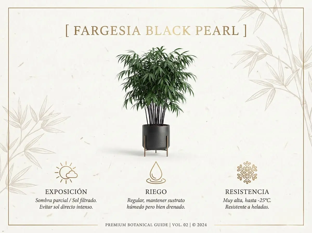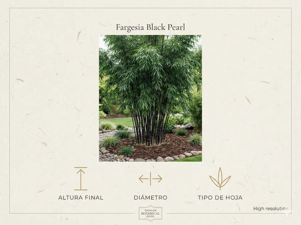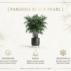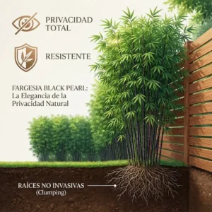 El Fargesia nitida ‘Black Pearl’ es una variedad moderna y muy codiciada porque resuelve el gran dilema del bambú negro. Hasta ahora, para tener cañas negras tenías que plantar el invasor Phyllostachys nigra. Con el ‘Black Pearl’, puedes disfrutar de ese color oscuro y elegante en un formato 100% no invasivo (cespitoso).