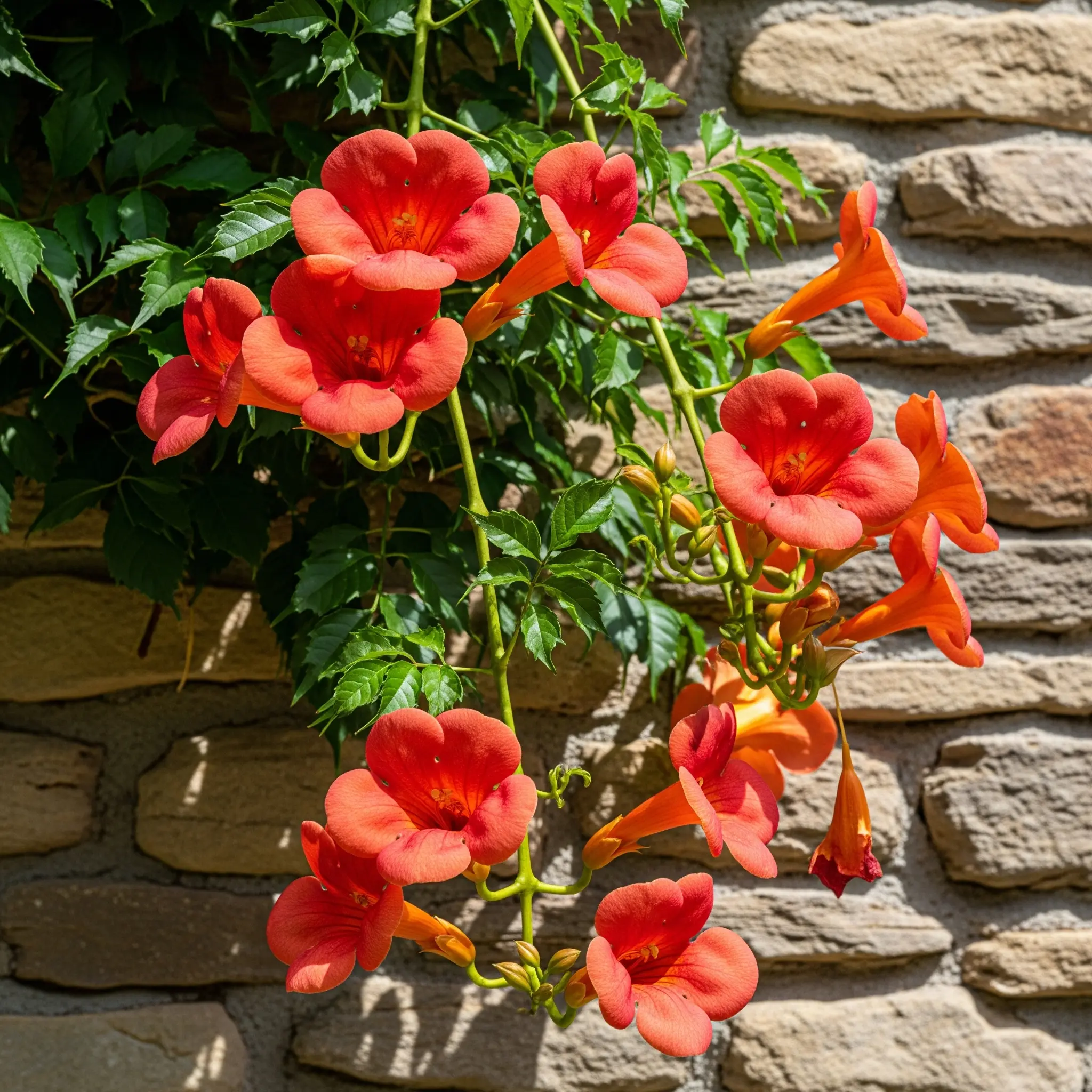 - Auto-adherente: A diferencia de otras trepadoras que necesitan alambres o guías, la Campsis desarrolla pequeñas raíces aéreas en sus tallos que le permiten agarrarse sola a muros de piedra, ladrillo u hormigón rústico.