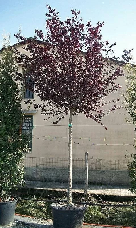 El Prunus cerasifera ‘Pissardii’ (o Ciruelo de Jardín) es un clásico insustituible en el diseño de jardines por su doble valor ornamental. Es famoso por ser uno de los primeros árboles en florecer: a finales de invierno, sus ramas desnudas se cubren de una multitud de pequeñas flores de color rosa pálido, anunciando el fin del frío antes de que broten las hojas.