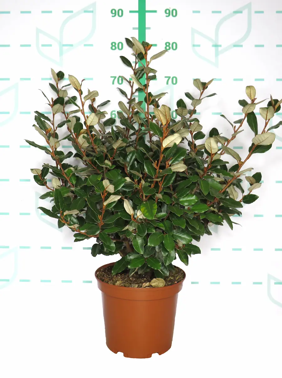 Su principal atractivo reside en su follaje perenne y coriáceo. Las hojas son de un verde oscuro brillante en la parte superior (haz) y de un sorprendente color plateado metálico en la parte inferior (envés). Cuando el viento mueve el seto, crea un espectacular contraste de verdes y platas.