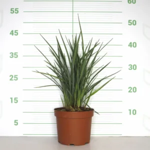 Forma matas compactas y muy ordenadas de hojas acintadas, rígidas y verticales, de un espectacular color azul-plateado que parece reflejar el cielo. Su porte es impecablemente arquitectónico, creando puntos de acento verticales que contrastan maravillosamente con plantas de formas más redondeadas. En primavera y verano, produce unas delicadas varas de pequeñas flores azul pálido que dan paso a su segundo gran atractivo: unas bayas esféricas de un increíble y brillante color azul-violeta metálico que persisten durante meses.