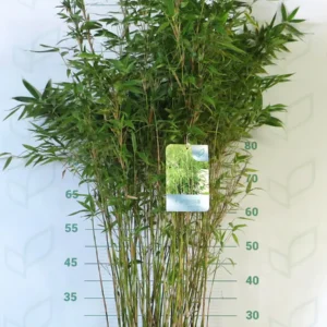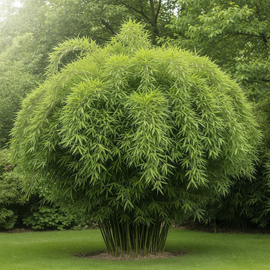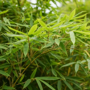 La estructura de este bambú es de una gran belleza. Las finas cañas de color verde oliva, que amarillean ligeramente con la edad, y su follaje de hojas pequeñas y lanceoladas, crean una textura muy fina y sofisticada. Su porte arqueado aporta una suavidad que pocas plantas para seto pueden igualar.