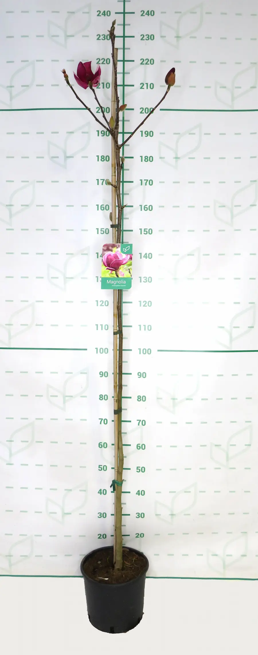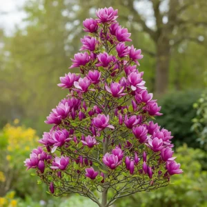 La Magnolia ‘Genie’ es un híbrido moderno que ha revolucionado el mercado por su coloración inusualmente oscura y su forma elegante. Sus flores, que aparecen en la primavera temprana antes que las hojas, tienen una forma de loto o tulipán muy marcada.