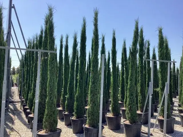 El Cupressus sempervirens (Ciprés Común o Ciprés Italiano) es un clásico indiscutible en la jardinería. Su porte columnar, oscuro y vertical aporta una elegancia formal y atemporal, a la vez que una pantalla de privacidad densa y duradera.