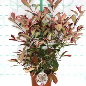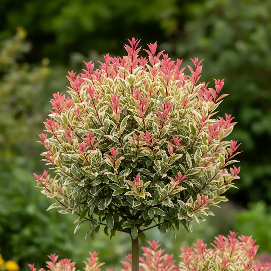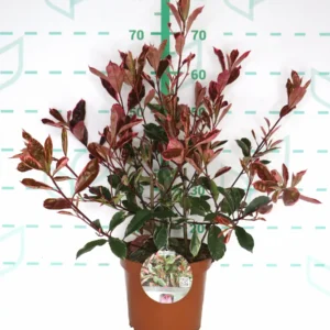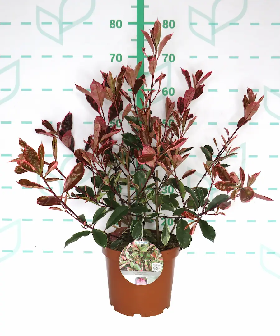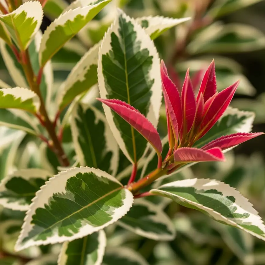 Si ya conoces y amas la explosión de color rojo de la clásica Photinia ‘Red Robin’, prepárate para una nueva dimensión de belleza. La variedad ‘Louise’ coge ese espectacular brote rojo y lo enmarca en un elegante follaje variegado en tonos crema y verde. El resultado es un arbusto perenne que no solo ofrece un color vibrante en primavera, sino un juego de tres colores durante todo el año, aportando una luminosidad y una sofisticación únicas.