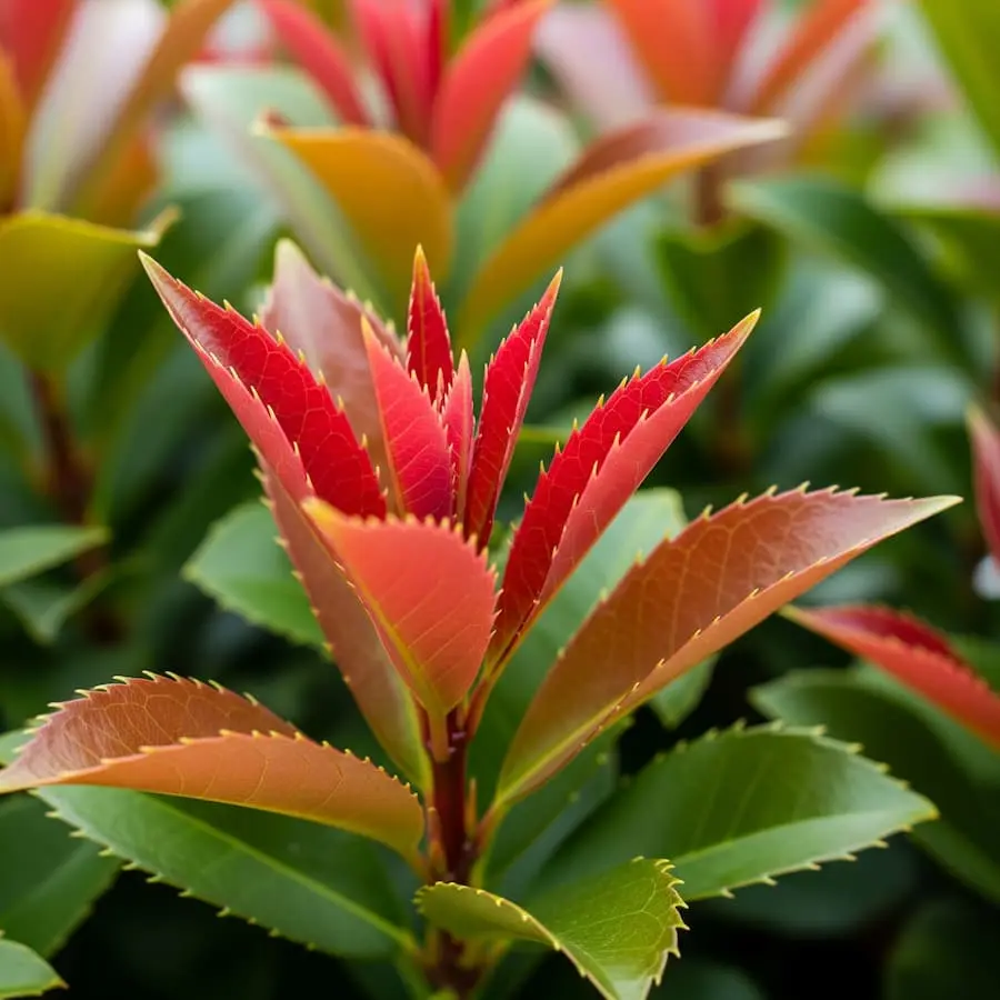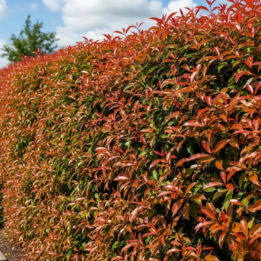 La Photinia ‘Magical Volcano’ es una auténtica revolución en el mundo de los setos. Si pensabas que todas las fotinias eran iguales, prepárate para una sorpresa. Esta variedad patentada destaca por dos características que la hacen única: el follaje nuevo emerge en un color rojo-anaranjado increíblemente brillante, como la lava de un volcán, y sus hojas tienen un borde fuertemente ondulado y dentado, aportando una textura rica y un carácter que ninguna otra fotinia posee.