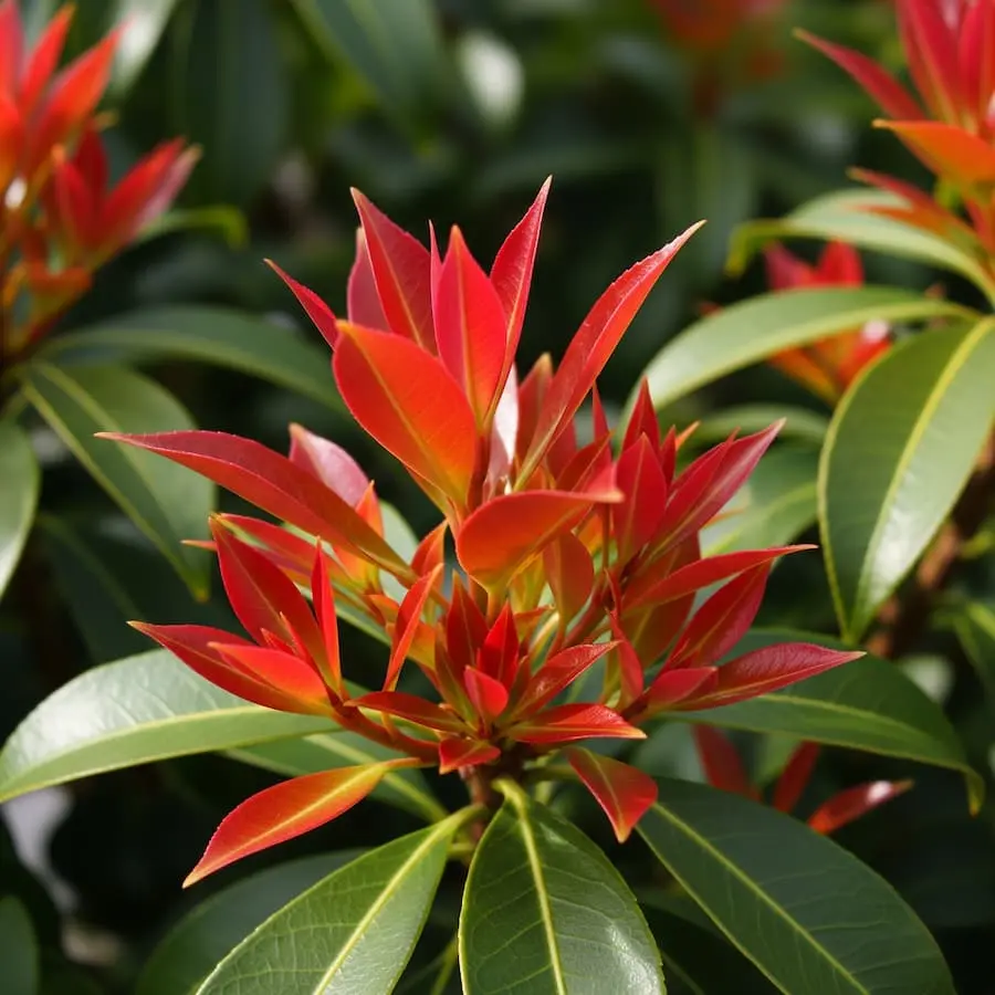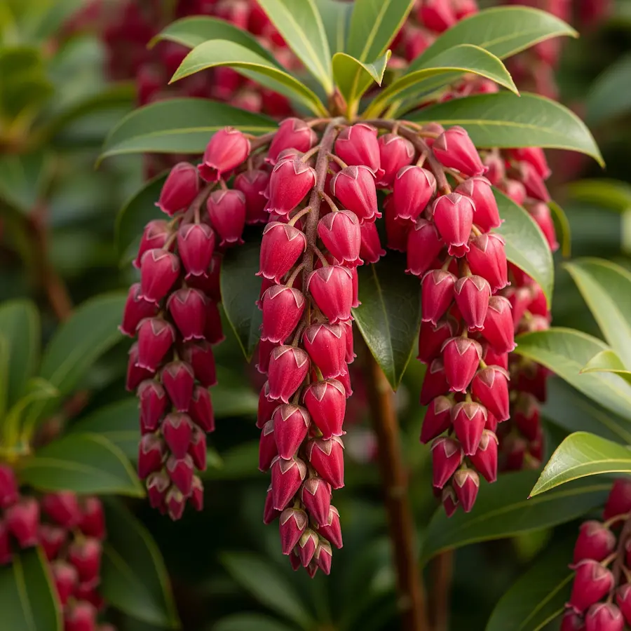 El Pieris japonica es un arbusto de una belleza sofisticada y cambiante, una verdadera joya para los rincones más resguardados del jardín. Es la planta perfecta para quien valora un espectáculo que evoluciona. No solo ofrece una de las floraciones primaverales más delicadas y elegantes, sino que, justo después, sorprende con una explosión de color en sus hojas nuevas que a menudo es incluso más llamativa que las propias flores. Es el protagonista indiscutible del jardín de sombra ácida.
