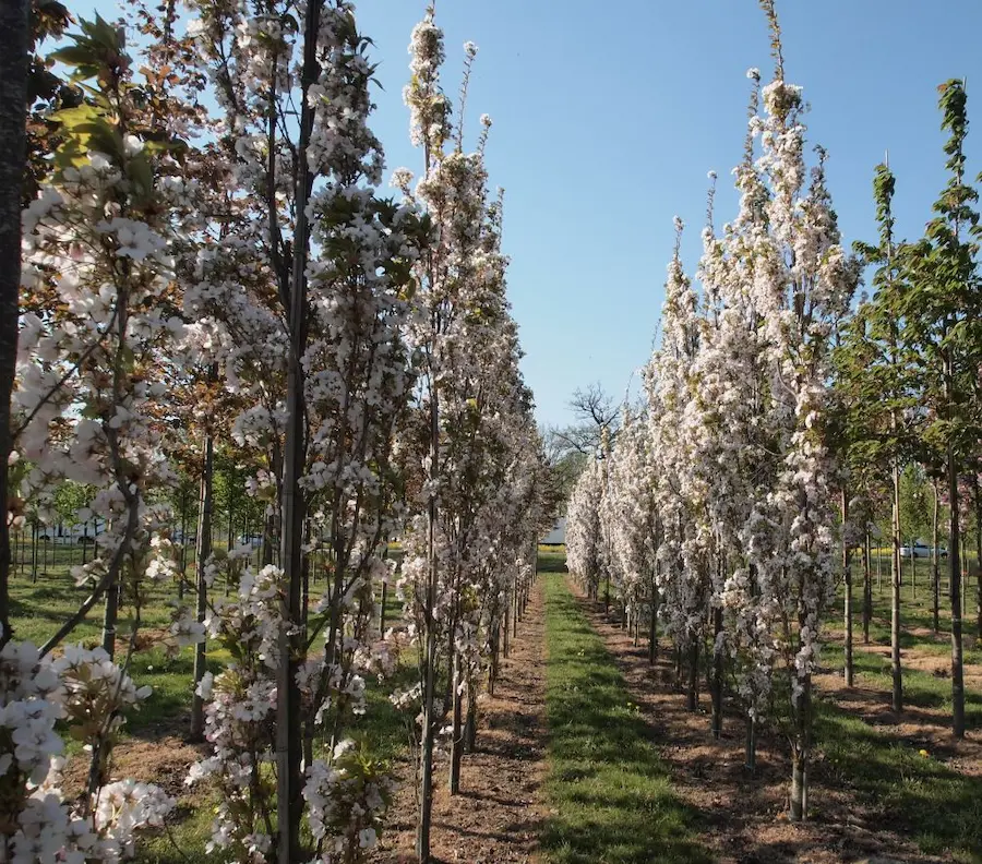 El Prunus serrulata ‘Amanogawa’ es la respuesta para todos aquellos que aman la explosión floral de los cerezos japoneses pero no disponen de un gran jardín. Esta variedad única y galardonada crece de forma estrictamente vertical, como una columna o un obelisco, llevando todo el espectáculo de la primavera hacia el cielo en lugar de hacia los lados. Su nombre ‘Amanogawa’ significa «Río Celestial» o «Vía Láctea» en japonés, una poética descripción de su forma de columna densamente cubierta de flores.
