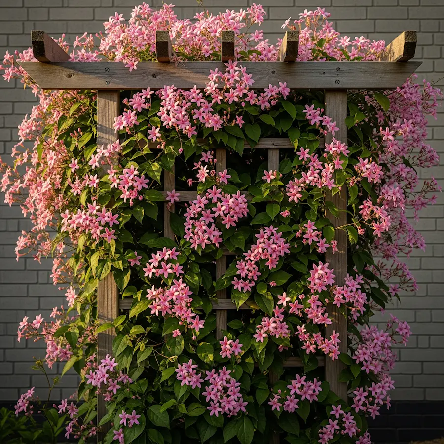 Si amas el perfume y la belleza del clásico Jazmín Estrellado, pero buscas un toque de color más original y exclusivo, el Trachelospermum ‘Pink Showers’ es tu planta. Esta rara y espectacular variedad coge todas las virtudes del falso jazmín tradicional —su follaje perenne, su increíble resistencia y su facilidad de cuidado— y las viste con unas preciosas flores en forma de estrella de un delicado y elegante color rosa pálido.