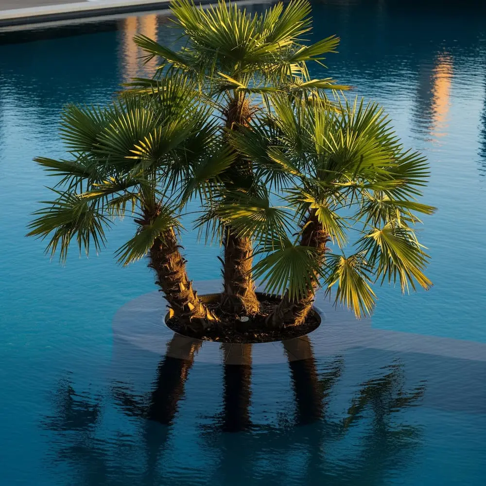 Este es su hábitat soñado. No hay nada que evoque más el verano que la silueta de una palmera reflejándose en el agua. Plantadas en grupo, crean privacidad y ofrecen una agradable sombra moteada. El sonido de sus hojas con la brisa es la banda sonora perfecta para una tarde de verano.