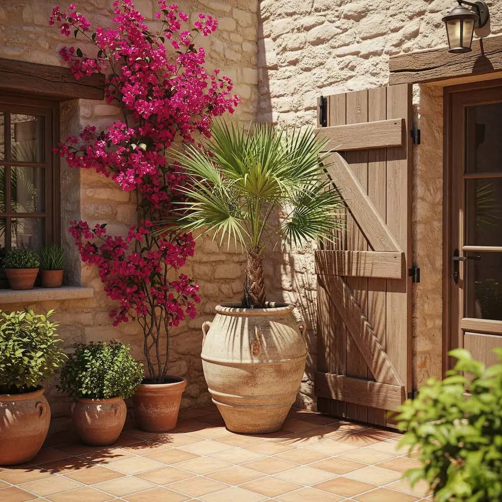 Aquí se siente como en casa. Combina a la perfección con grandes macetones de terracota, muros de piedra y suelos de barro. Plantada junto a olivos, lavandas o un Ciprés Común, ayuda a crear un paisaje que evoca las villas de la Toscana o las Baleares